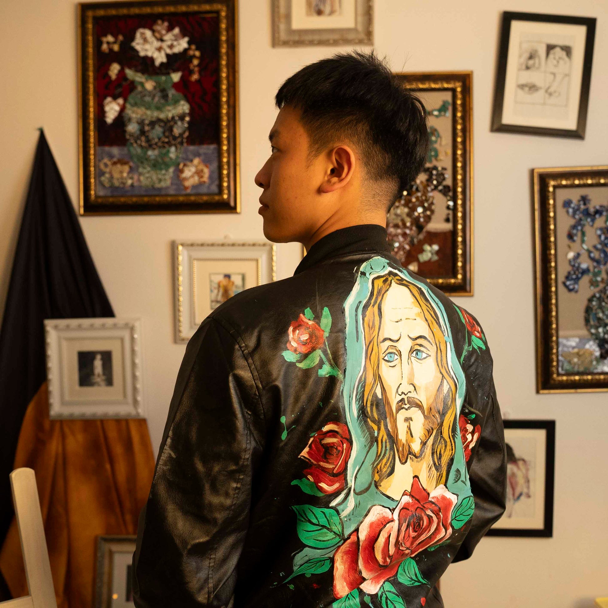 The "Sacred Bloom" leather jacket is a bold and meaningful piece of wearable art, crafted by Jason with intricate hand-painted details. The jacket features a striking image of Jesus on the back, surrounded by a wreath of red roses. This powerful design merges spirituality with nature, symbolizing love, sacrifice, and rebirth. The rich black leather provides a bold backdrop that allows the vivid red roses and serene depiction of Jesus to stand out in vibrant contrast.